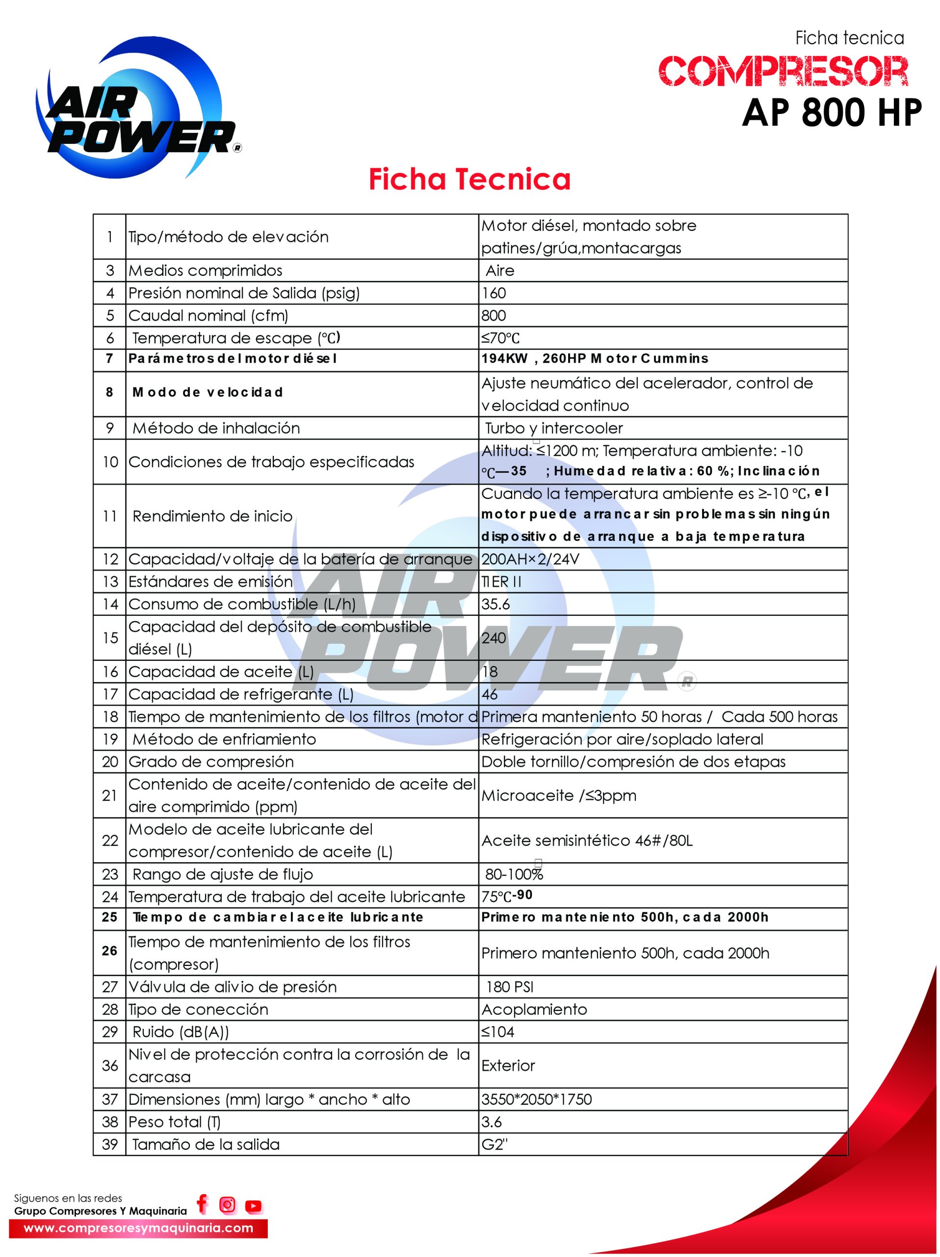 El compresor de aire de 800 HP cuenta con un peso de 3600 kg , unas dimensiones de 3.5m x 2m x 1.8m, y capacidad para 240 Lts lo que lo hace una máquina potente.